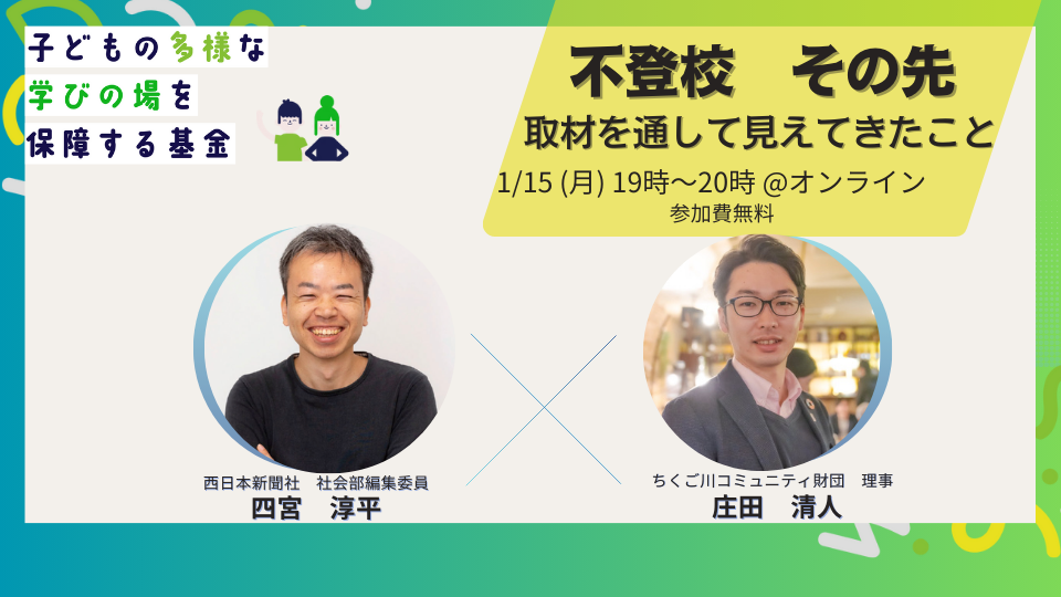 不登校についての取材や記事執筆を続ける西日本新聞社の四宮淳平さん(社会部編集委員)に、取材を通して見えてきたことを深掘りしてお話しいただきます。昨年12月1日以降、多様な学び基金について6回にわたり記事を書いていただきました。