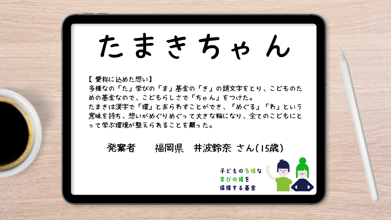 多様なの「た」学びの「ま」基金の「き」の頭文字をとり、こどものためなので、こどもらしさで「ちゃん」をつけた。たまきは漢字で「環」とあらわすことができ、「めぐる」「わ」という意味を持ち、想いがめぐりめぐって大きな輪になり、全ての子どもにとって学ぶ環境が整えられることを願った。