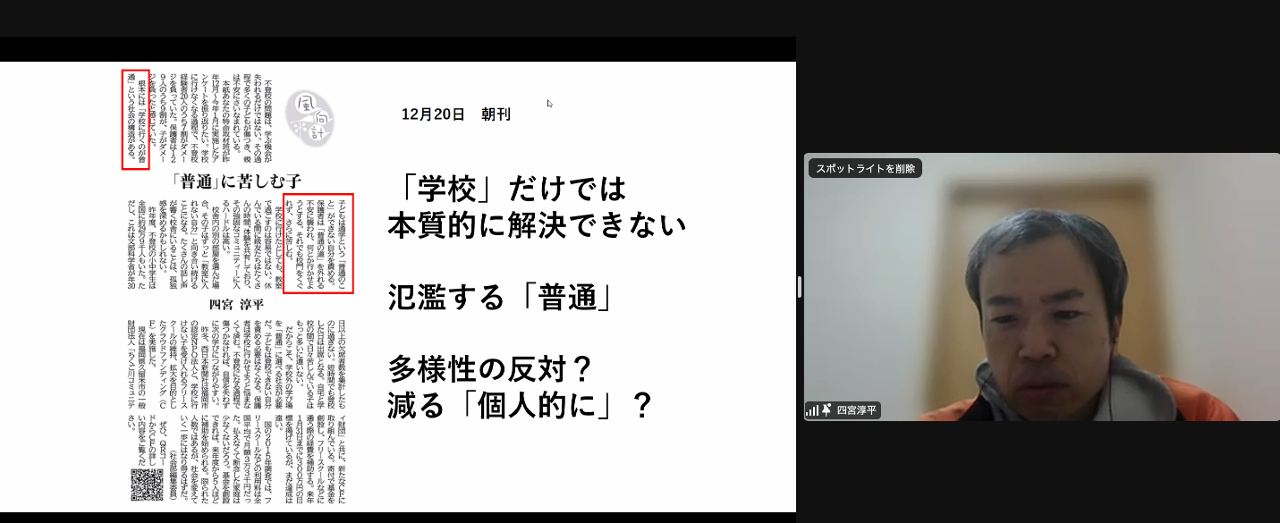 参加者の方からは、「不登校児や不登校生が卒業(中卒や高卒)以降のケアについての考えを聞きたい」、「”普通”という言葉ではなく、その子にとっての”普段”を大事にすることが重要ではないか」などたくさんの質問、ご意見をいただきました。