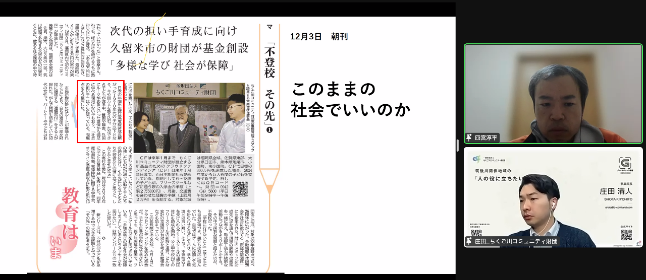 これまでに西日本新聞に掲載された5つの記事をもとに、「学校に行くことが普通」という考えに苦しむ不登校の子どもや保護者がいること、四宮さんが記事を書くこと以外にも何かできることがないかと考え、ちくご川コミュニティ財団との協働に至ったことなどが語られました。