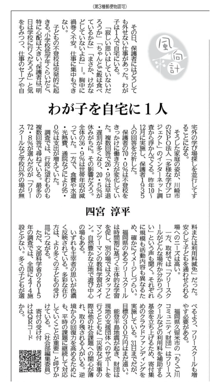1月24日の西日本新聞オピニオン面「風向計」に、多様な学び基金に関する記事が掲載されました。記事を執筆頂いたのは、社会部編集委員で教育分野担当の四宮淳平さんです。