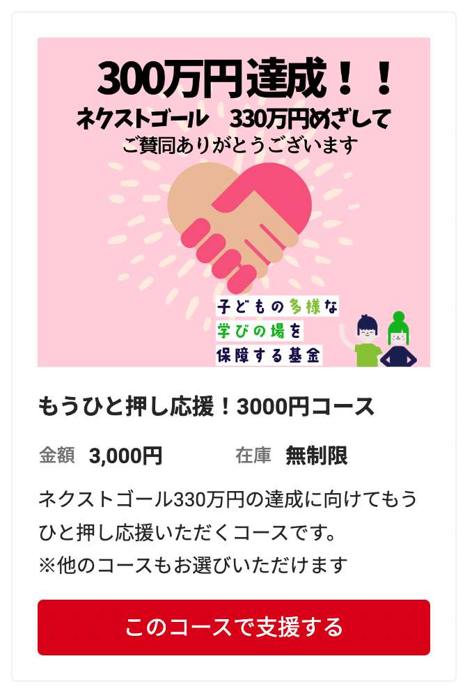 ネクストゴール330万円の達成に向けてもうひと押し応援いただくコースです。
