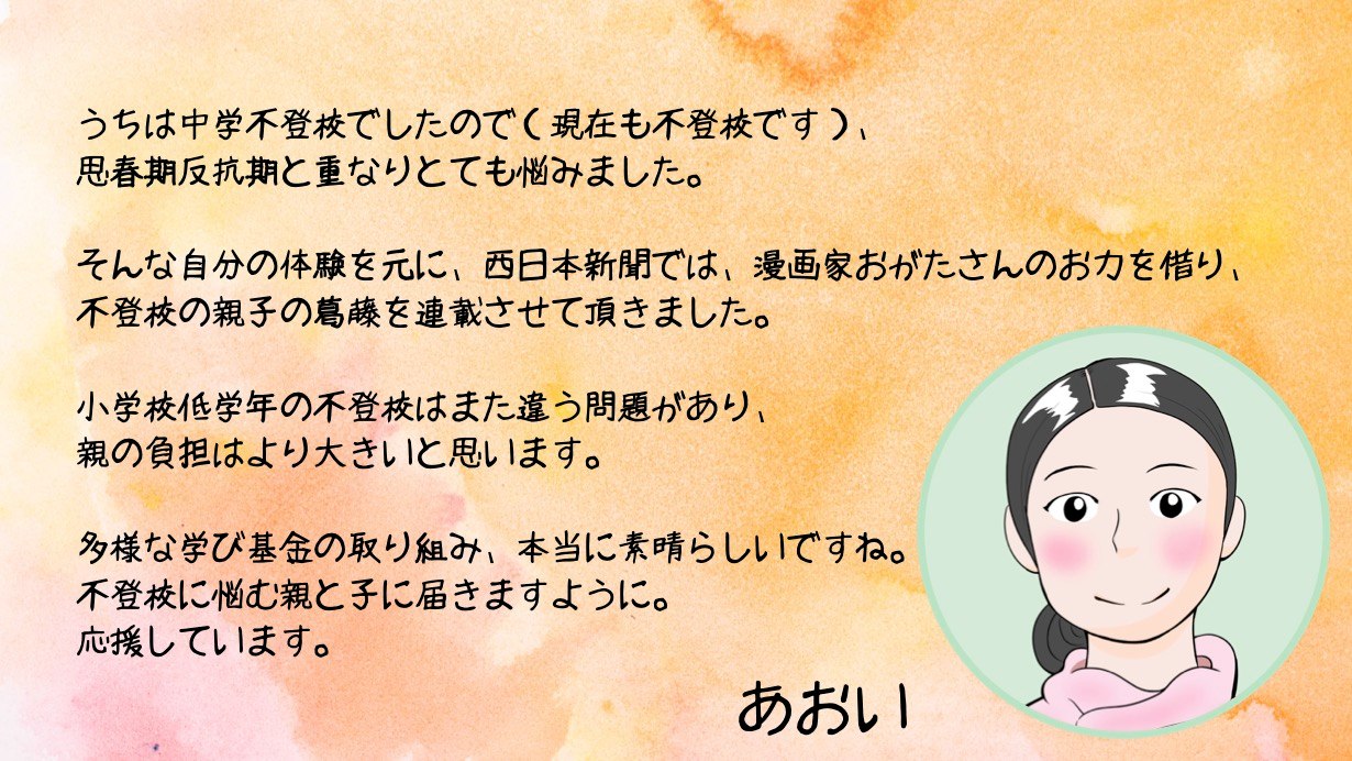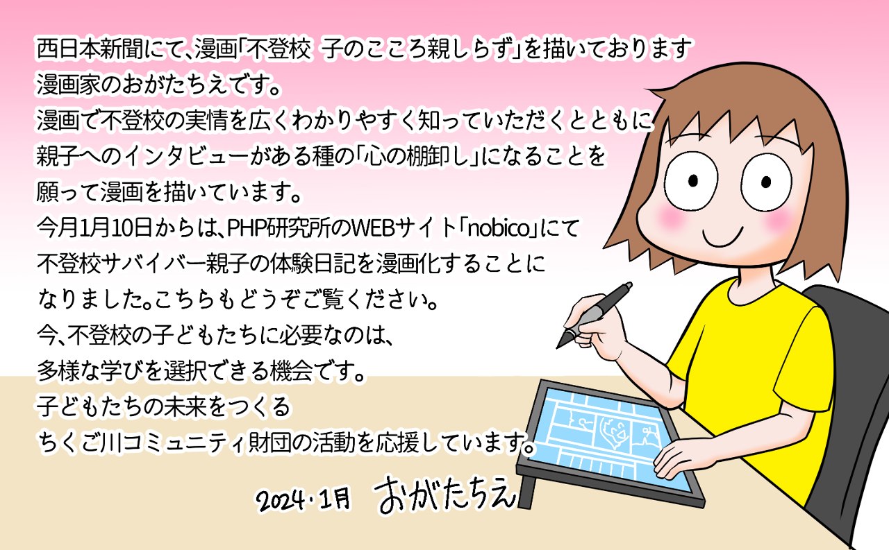 西日本新聞meではネクストゴール最終日の31日まで漫画「不登校子のこころ親知らず」が無料公開中です。先日のキックオフイベントでお披露目させていただいた、原作者のあおいさん、漫画家のおがたちえさんからの応援メッセージをご紹介します。