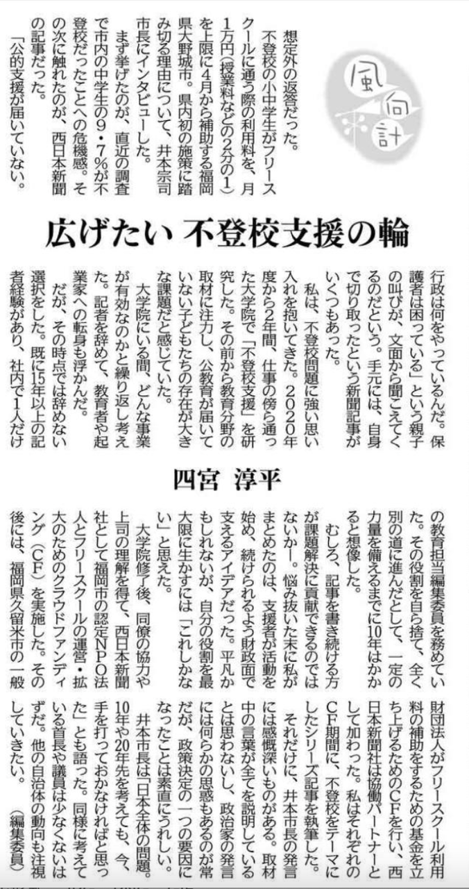 このプロジェクトに加わる西日本新聞社(福岡市)は九州トップの発行部数を誇るブロック紙で、教育や多様な学びに関する報道を続けています。基金の立ち上げや奨学金事業に関する情報を地域に届けるために報道します。