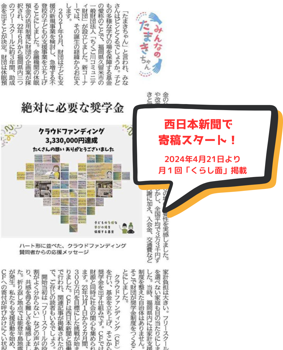 寄稿では、2023年12月から2024年1月にかけて実施したクラウドファンディングで設立した「子どもの多様な学びの場を保障する基金(たまきちゃん)」誕生の背景や活動の進捗などをご紹介。奨学生や賛同者の皆さまの声も届けます。