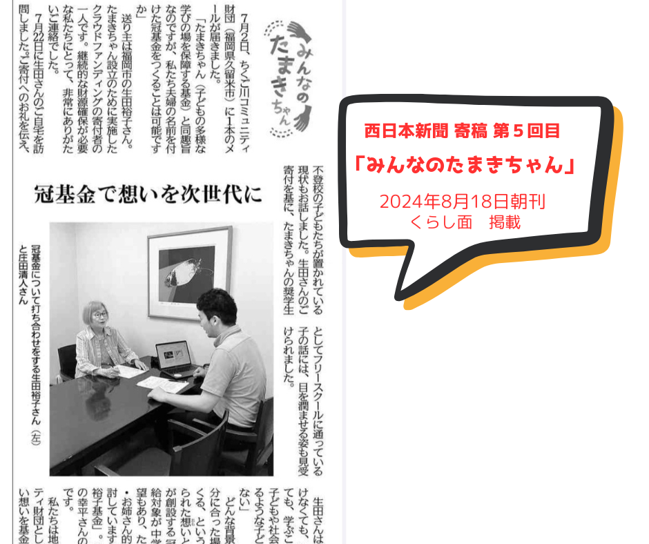 学校に行けない・行かない子どもたちの多様な学びを守るための基金「たまきちゃん」の進捗や私たちの想いを紹介する寄稿「みんなのたまきちゃん」が、8月18日の西日本新聞朝刊くらし面に掲載されました。