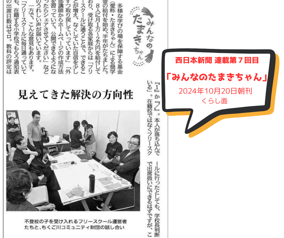 いつも「子どもの多様な学びの場を保障する基金(たまきちゃん)」を応援いただきありがとうございます。西日本新聞へ連載中の寄稿「みんなのたまきちゃん」第6回目が、10月20日朝刊くらし面に掲載されました。