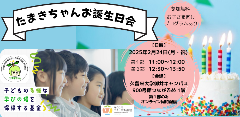 2月24日(祝日)、基金設立1周年記念イベント「たまきちゃんお誕生日会」を久留米大学御井キャンパスで開催します。