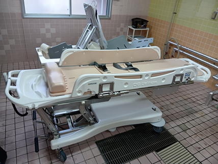 ▲特別養護老人ホーム いこいの村・梅の木寮(京都府綾部市)の寝台浴槽を新しく入れ替え、寝たきりや座位保持が困難な方も安心して入浴できるようになりました。