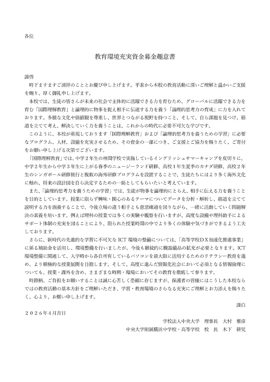 平素より、中央大学附属横浜中学校・高等学校の教育活動にご理解とご支援を賜り、厚く御礼申し上げます。