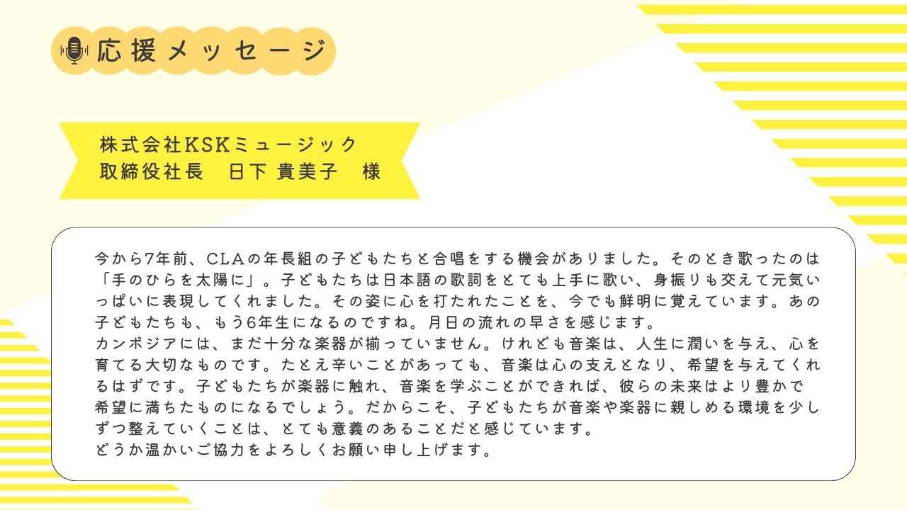 2025-09-16 18:00【応援メッセージをいただきました】クラウドファンディングにご支援いただきました株式会社KSKミュージック 日下様より応援メッセージをいただきました!2025-09-16 18:00【応援メッセージをいただきました】クラウドファンディングにご支援いただきました株式会社KSKミュージック 日下様より応援メッセージをいただきました!