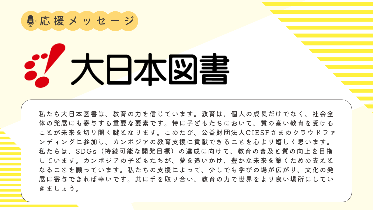 2025-09-12 10:00【応援メッセージをいただきました】クラウドファンディングにご支援いただきました大日本図書株式会社様より応援メッセージをいただきました!2025-09-12 10:00【応援メッセージをいただきました】クラウドファンディングにご支援いただきました大日本図書株式会社様より応援メッセージをいただきました!