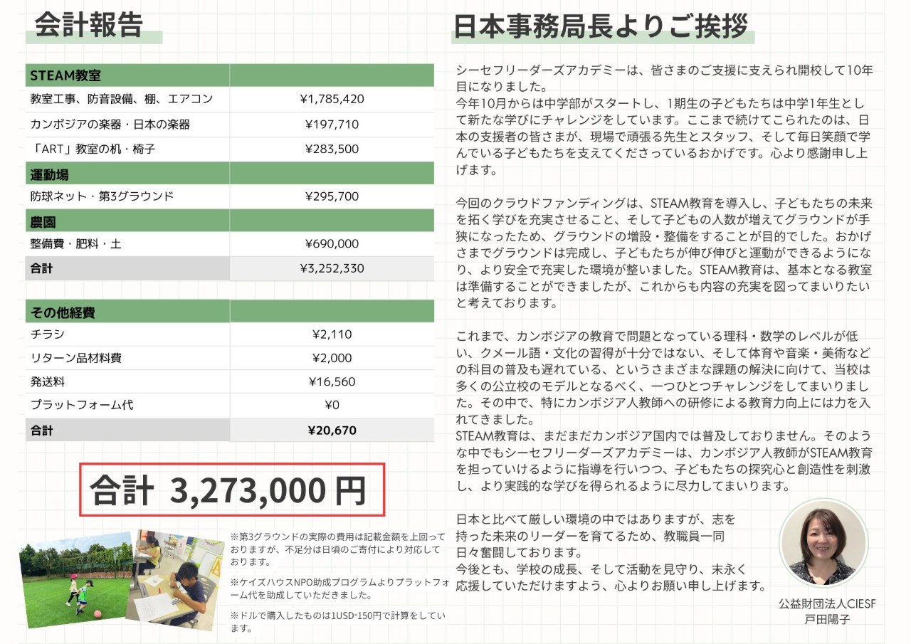 本メールにて、クラウドファンディングの成果を資料とともにご報告申し上げますとともに、今後も活動の進捗や現地の様子につきましては、随時ご報告してまいります。