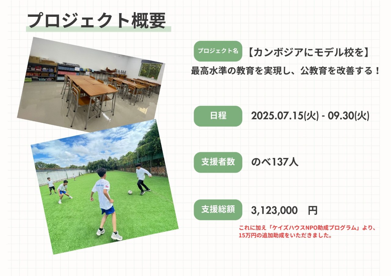 公益財団法人CIESF(シーセフ)がカンボジアで運営する幼小中一貫校「CIESF Leaders Academy」はカンボジアでモデル校となり、国内に広げ、公教育の改善を目指します。モデル校としてSTEAM教育を実現し、芸術をするための教室の整備と備品の購入、またグラウンド増設と整備、併せて学習農園も作ります。子どもたちにさらなる質の高い教育を届け、カンボジア教師の育成も図ります。
