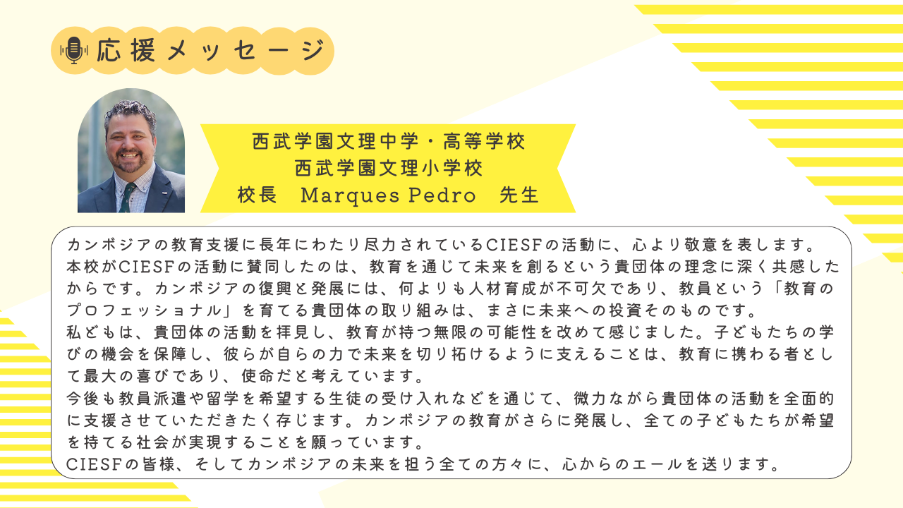 ご支援いただいている西武学園文理中学・高等学校の校長Marques Pedro様より応援メッセージをいただきました!