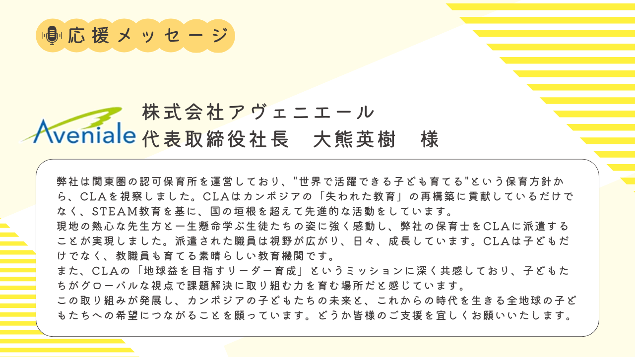 「教員のエクスチェンジプロジェクト」でご協力いただいている「株式会社アヴェニエール 代表取締役社長 大熊英樹様」より応援メッセージをいただきました!
