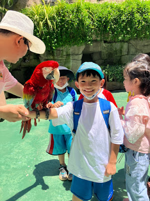 右の写真:サファリで動物に触れる子どもたち