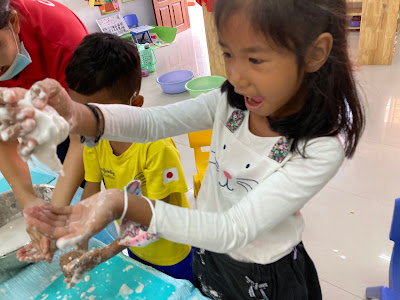 左の写真:片栗粉の感触遊び