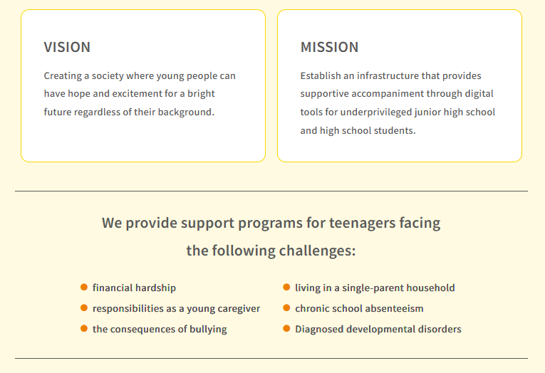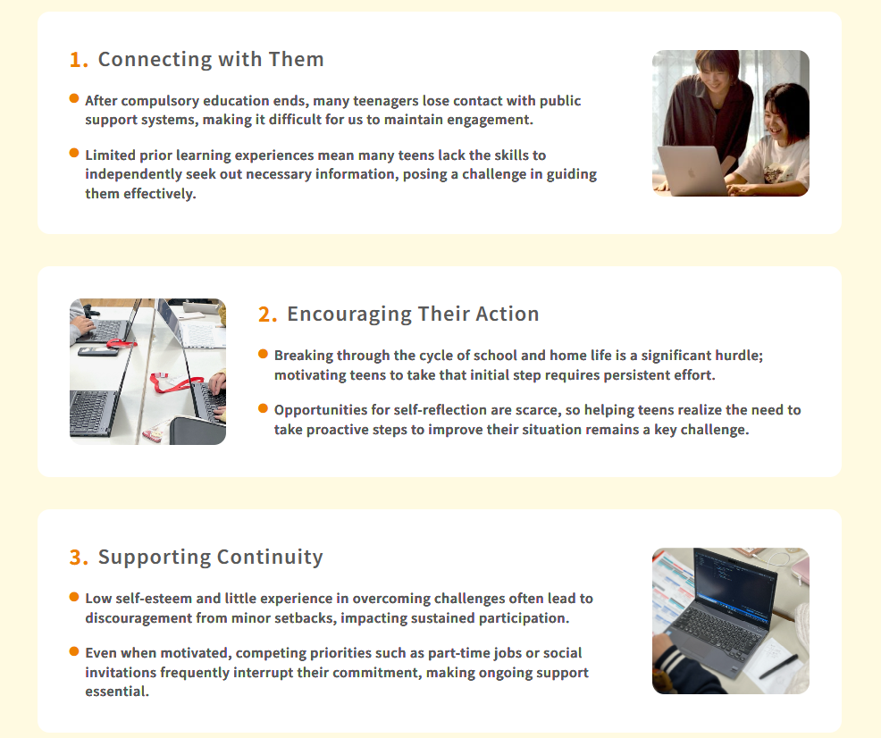 This is why we focus on equipping high school students facing hardship with professional digital skills and the resilience to build their own lives. Through programming education and career support, CLACK helps young people gain both expertise and the “life skills” needed to move forward independently. We call this approach “empowerment for self-reliance.”