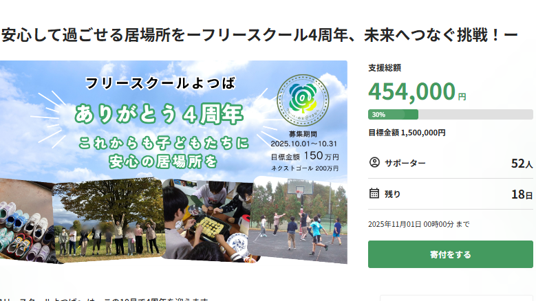 皆さまのご支援のおかげで、フリースクールよつばでは 今日も子どもたちが安心して過ごせる時間を積み重ねることができています。