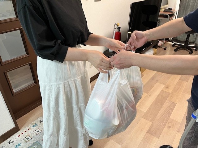 毎週火曜日に本人の希望する食材を、スタッフが購入して無償でお渡しします。食材の他、洗剤、シャンプー、歯ブラシ、ティッシュなど生活用品もお渡しています。また、衣類や下着、靴などが無い方には、スタッフと一緒に購入しに行きます。