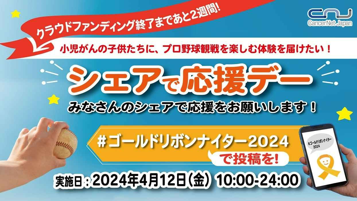 2024-04-12 10:00\本日4/12(金)24時まで、第2弾「シェアで応援デー」を開催/4/12(金)24時まで「シェアで応援デー」実施中! 「#ゴールドリボンナイター2024」のハッシュタグをつけて、こちらの投稿をシェアお願いいたします。 コメントもいただけるとうれしいです。 小児がんの子供たちに、プロ野球観戦を楽しむ体験を届けたい! ~クラウドファンディングも終了まで残り2週間です~ NPO法人キャンサーネットジャパンでは、小児がん啓発月間の9月に、小児がんの子供たちやご家族をプロ野球観戦に招待する「ゴールドリボンナイター」を開催します。 そのためのクラウドファンディングを4月末まで実施中です。 しかし、まだ目標額には届いていないのが現状です。 ぜひ目標額を達成し、今年も、小児がんの子供たちとそのご家族に楽しい時間を過ごしていただきたく 第2弾「シェアで応援デー」(4/12(金)10時~24時)にて、シェアやリポストで応援してください!2024-04-12 10:00\本日4/12(金)24時まで、第2弾「シェアで応援デー」を開催/4/12(金)24時まで「シェアで応援デー」実施中! 「#ゴールドリボンナイター2024」のハッシュタグをつけて、こちらの投稿をシェアお願いいたします。 コメントもいただけるとうれしいです。 小児がんの子供たちに、プロ野球観戦を楽しむ体験を届けたい! ~クラウドファンディングも終了まで残り2週間です~ NPO法人キャンサーネットジャパンでは、小児がん啓発月間の9月に、小児がんの子供たちやご家族をプロ野球観戦に招待する「ゴールドリボンナイター」を開催します。 そのためのクラウドファンディングを4月末まで実施中です。 しかし、まだ目標額には届いていないのが現状です。 ぜひ目標額を達成し、今年も、小児がんの子供たちとそのご家族に楽しい時間を過ごしていただきたく 第2弾「シェアで応援デー」(4/12(金)10時~24時)にて、シェアやリポストで応援してください!