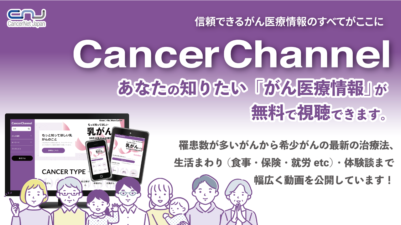 CancerChannel offers free videos on the latest information about treatment for cancers such as colorectal, lung, stomach, breast, and prostate cancers, as well as rare cancers, side effects, and various cancer-related topics (e.g., patient experiences, dietary and exercise practice, sexuality related concerns, employment, mental health care) for all generations, including children, adolescent and young adults (AYA), and the elderly.