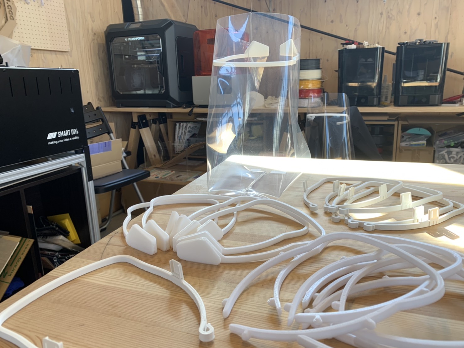 DDD.Laboには3Dプリンターやレーザーカッター、各種工具が置かれ様々なものづくりが可能な設備が整っています。この苦境に何か地域の力になれないかと考え、ものづくり設備を利用して医療物資を支援することにしました。大阪大学の中島教授のグループが考案したクリアファイルを使ったフェイスシールドを元に、地域の医療機関と連携して改良し、既に地域の30ほどの医療機関に提供しています。