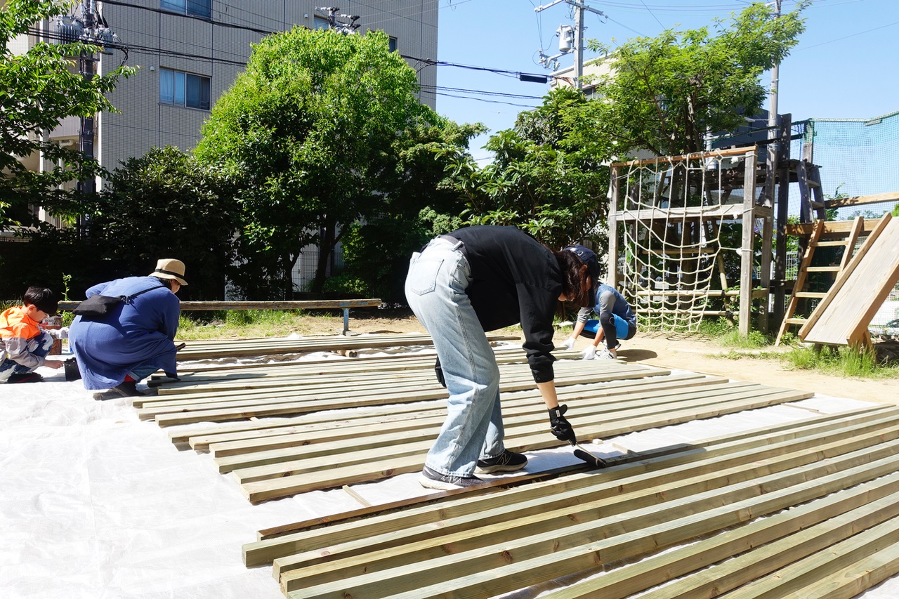 午後からは、ウッドテラスは床や、柵を作りました。木材をずらしながら、インパクトを打ち、どんどんと形になっていきます。
