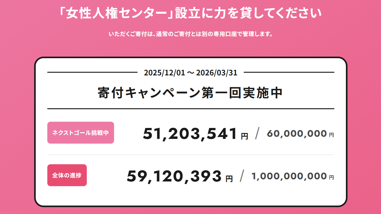 2026-03-17 12:17寄付キャンペーン第一回、終了まであと2週間!応援者数1500名を目指して、呼びかけを続けます。女性人権センター建設をご支援くださっているみなさま、ありがとうございます。 第一回寄付キャンペーンは、3月末までの目標5,000万円を達成し、ネクストゴール6,000万円を目指してご寄付の呼びかけを継続しています。 この週末で100名以上の方から200万円以上の寄付をいただき、5,452万円を超えました!ありがとうございます。2026-03-17 12:17寄付キャンペーン第一回、終了まであと2週間!応援者数1500名を目指して、呼びかけを続けます。女性人権センター建設をご支援くださっているみなさま、ありがとうございます。 第一回寄付キャンペーンは、3月末までの目標5,000万円を達成し、ネクストゴール6,000万円を目指してご寄付の呼びかけを継続しています。 この週末で100名以上の方から200万円以上の寄付をいただき、5,452万円を超えました!ありがとうございます。