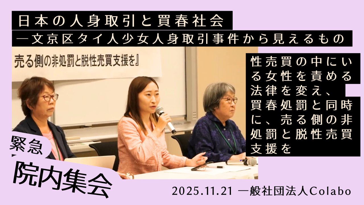 2025-11-23 19:47【緊急院内集会・開催報告】『日本の人身取引と買春社会―文京区タイ人少女人身取引事件から見えるもの』女性人権センター建設プロジェクトにご賛同いただいているみなさま、ご支援、ありがとうございます。 「女性人権センター」は、女性を処罰の対象とする売春防止法からの脱却と、買春禁止法制定に向けた運動の基盤にすることも目指していますが、 今、タイ人の12歳の少女が一か月で60人以上を相手に「売春」させられた事件をきっかけに「買春処罰法」導入を求める声が高まっています。 今国会で高市首相が買春処罰に言及しましたが、買春処罰と同時に女性の非処罰と脱性売買支援をしなければ、搾取の構造は変わらないため、緊急院内集会を開催しました。 首相が買春処罰に言及したことにより、「買春禁止」だけでなく、性を売る状況にある人の非犯罪化と脱性売買支援を盛り込んだ「性売買防止法」の必要性を訴えていく段階に入ったと考えています。 院内集会の様子を動画で公開しました。ぜひご覧ください。2025-11-23 19:47【緊急院内集会・開催報告】『日本の人身取引と買春社会―文京区タイ人少女人身取引事件から見えるもの』女性人権センター建設プロジェクトにご賛同いただいているみなさま、ご支援、ありがとうございます。 「女性人権センター」は、女性を処罰の対象とする売春防止法からの脱却と、買春禁止法制定に向けた運動の基盤にすることも目指していますが、 今、タイ人の12歳の少女が一か月で60人以上を相手に「売春」させられた事件をきっかけに「買春処罰法」導入を求める声が高まっています。 今国会で高市首相が買春処罰に言及しましたが、買春処罰と同時に女性の非処罰と脱性売買支援をしなければ、搾取の構造は変わらないため、緊急院内集会を開催しました。 首相が買春処罰に言及したことにより、「買春禁止」だけでなく、性を売る状況にある人の非犯罪化と脱性売買支援を盛り込んだ「性売買防止法」の必要性を訴えていく段階に入ったと考えています。 院内集会の様子を動画で公開しました。ぜひご覧ください。