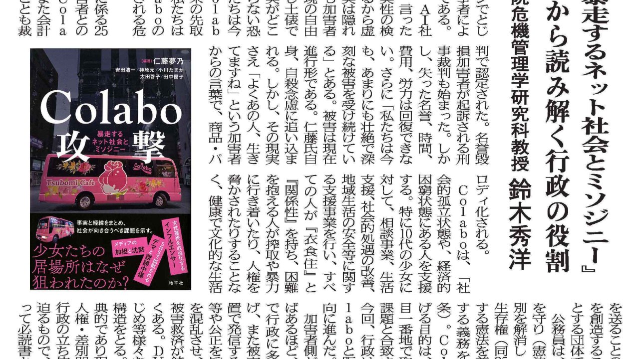 2026-03-20 19:20都政新報に掲載『「Colabo攻撃~暴走するネット社会とミソジニー」から読み解く行政の役割2026年3月6日の都政新報に『Colabo攻撃』の書評をいただきました。 「少女らの声から始まり少女らのメッセージでとじる、徹頭徹尾当事者による事実記録の書」 「古典的であり現代的である人権・差別問題に関し、行政の立ち位置の再考を迫るもので、公務員にとっての必読書」 たくさんの方に読んで、自分ごととして考えていただきたいです。2026-03-20 19:20都政新報に掲載『「Colabo攻撃~暴走するネット社会とミソジニー」から読み解く行政の役割2026年3月6日の都政新報に『Colabo攻撃』の書評をいただきました。 「少女らの声から始まり少女らのメッセージでとじる、徹頭徹尾当事者による事実記録の書」 「古典的であり現代的である人権・差別問題に関し、行政の立ち位置の再考を迫るもので、公務員にとっての必読書」 たくさんの方に読んで、自分ごととして考えていただきたいです。