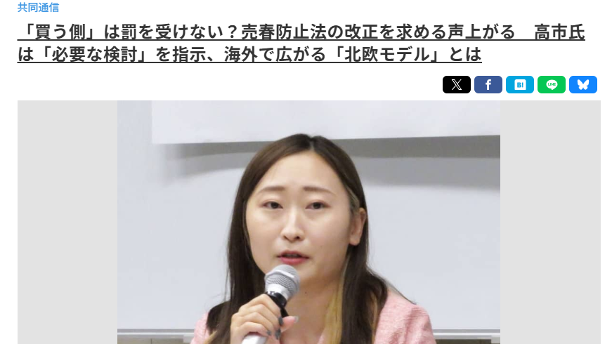 2026-03-23 19:30共同通信で報道『「買う側」は罰を受けない?売春防止法の改正を求める声上がる』『「買う側」は罰を受けない?売春防止法の改正を求める声上がる 高市氏は「必要な検討」を指示、海外で広がる「北欧モデル」とは』(共同通信) 2026年2月27日、国会で買春処罰に関する議論がはじまることを受けて、代表の仁藤のコメントが掲載されました。 Colaboは2024年度、未成年の少女88人を含む308人から新規相談を受けました。(前年度からの継続相談を除いた数です) ホストクラブなどで少女が加害者と知り合い、恋愛関係にあると思い込まされた上での売春や、反社会的組織による管理売春などの実態を伝えています。2026-03-23 19:30共同通信で報道『「買う側」は罰を受けない?売春防止法の改正を求める声上がる』『「買う側」は罰を受けない?売春防止法の改正を求める声上がる 高市氏は「必要な検討」を指示、海外で広がる「北欧モデル」とは』(共同通信) 2026年2月27日、国会で買春処罰に関する議論がはじまることを受けて、代表の仁藤のコメントが掲載されました。 Colaboは2024年度、未成年の少女88人を含む308人から新規相談を受けました。(前年度からの継続相談を除いた数です) ホストクラブなどで少女が加害者と知り合い、恋愛関係にあると思い込まされた上での売春や、反社会的組織による管理売春などの実態を伝えています。