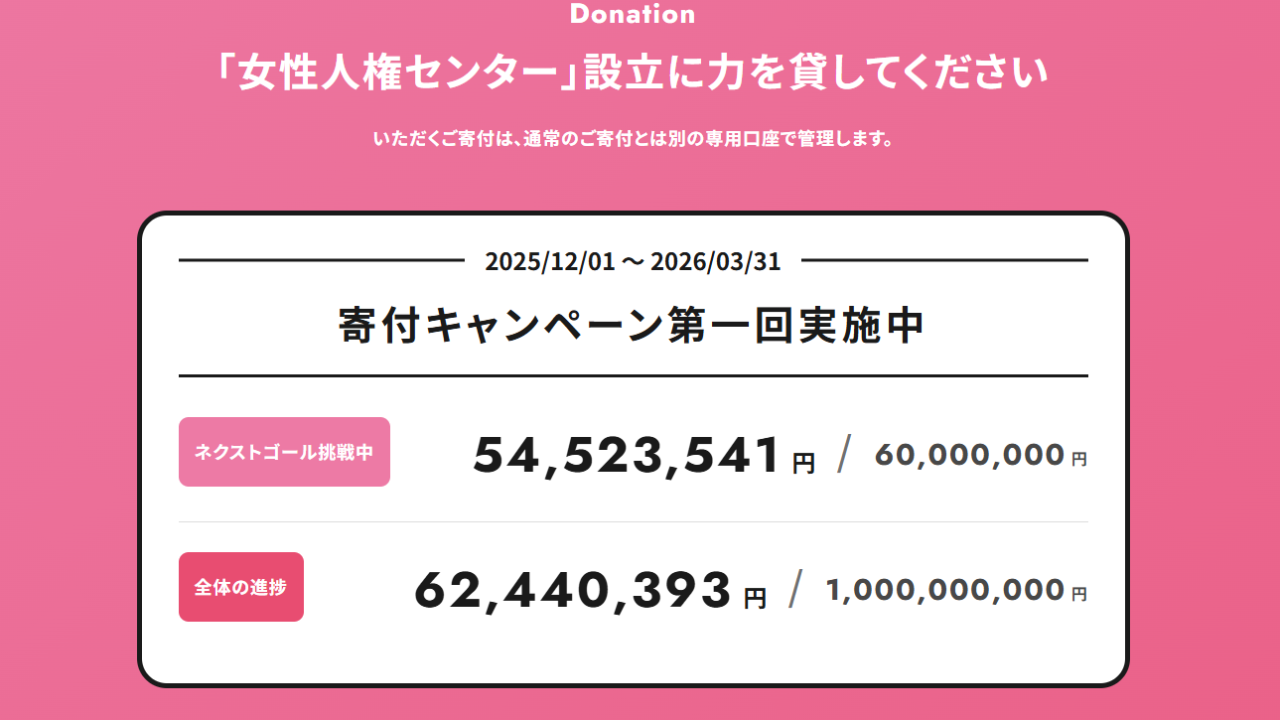 「女性人権センター」の建設には、10億円が必要です。 大きな目標ですが、はじめにたくさんの方に賛同を示していただくことが、次につながります。