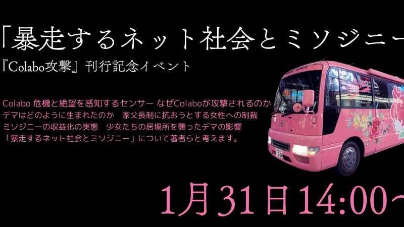 2026-01-13 18:391/31刊行記念イベント開催 『Colabo攻撃-暴走するネット社会とミソジニー』(地平社)サポーター会員の皆様、いつもありがとうございます。 1月20日に『Colabo攻撃-暴走するネット社会とミソジニー』(地平社)を出版します。 刊行を記念し、1月31日に著者・関係者と出版記念イベントを行うことになりました。 『少女たちの居場所は、なぜ狙われたのか?』 2022年から深刻化したColaboに対する「会計不正」などのデマや誹謗中傷。 この本では、私たちに何が起きたのか、Colaboが受けてきた妨害とその影響について、現場を見続けてきた方々とまとめました。 なぜ、Colaboの活動が必要なのか。 なぜ、市民の方のご寄付で活動を続けることが必要なのか。 どうして、性搾取の構造を変えるため、共に『闘う』サポーター会員が必要なのか。 そのことも、より深く理解していただける一冊です。 ぜひお読みいただき、出版記念イベントにもご参加ください。(後日配信あり)2026-01-13 18:391/31刊行記念イベント開催 『Colabo攻撃-暴走するネット社会とミソジニー』(地平社)サポーター会員の皆様、いつもありがとうございます。 1月20日に『Colabo攻撃-暴走するネット社会とミソジニー』(地平社)を出版します。 刊行を記念し、1月31日に著者・関係者と出版記念イベントを行うことになりました。 『少女たちの居場所は、なぜ狙われたのか?』 2022年から深刻化したColaboに対する「会計不正」などのデマや誹謗中傷。 この本では、私たちに何が起きたのか、Colaboが受けてきた妨害とその影響について、現場を見続けてきた方々とまとめました。 なぜ、Colaboの活動が必要なのか。 なぜ、市民の方のご寄付で活動を続けることが必要なのか。 どうして、性搾取の構造を変えるため、共に『闘う』サポーター会員が必要なのか。 そのことも、より深く理解していただける一冊です。 ぜひお読みいただき、出版記念イベントにもご参加ください。(後日配信あり)