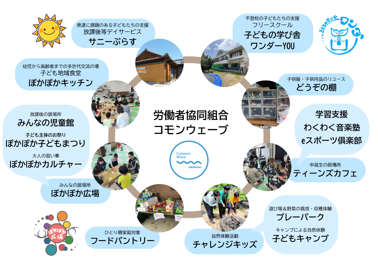 私たち「労働者協同組合コモンウェーブ」は2022年10月の設立以来、1人でも多くの未来ある子ども・若者たちが自分らしく生きていくことができるようにと願って、様々な居場所事業や子育て支援事業を展開しています。