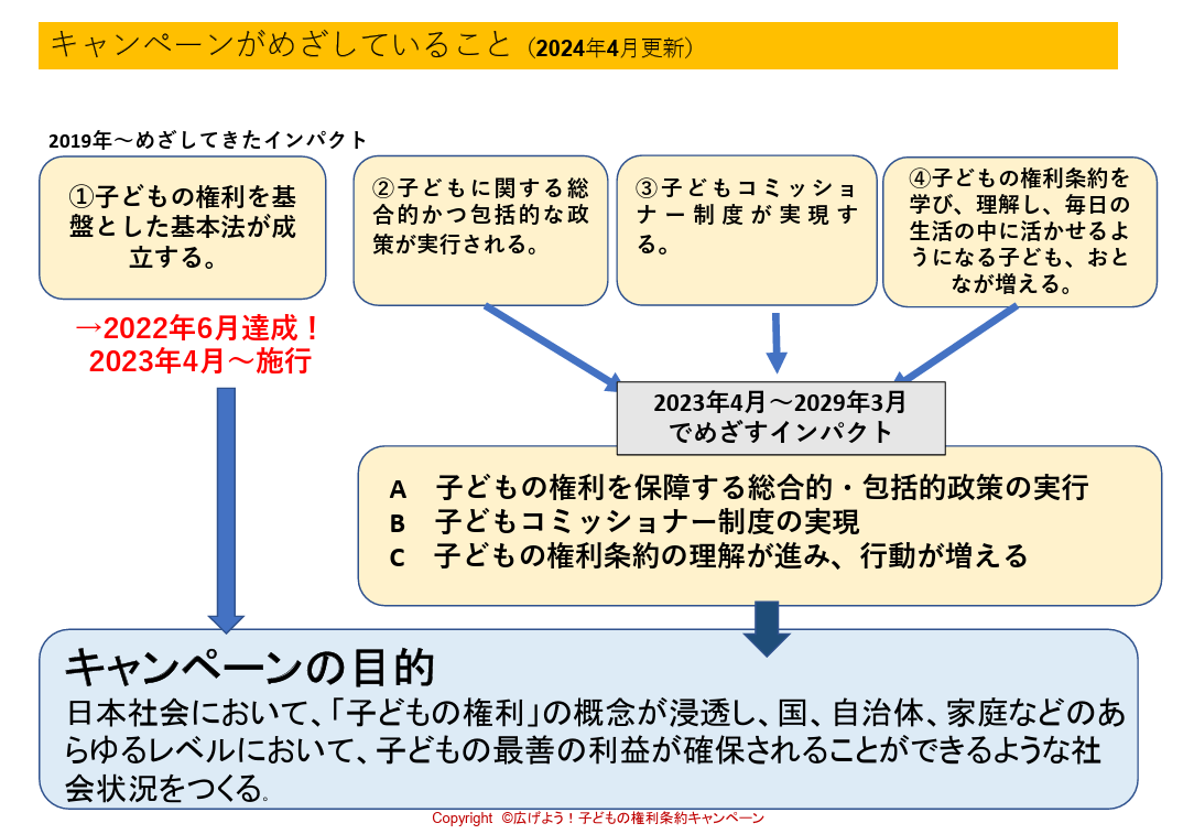 日本社会において、「子どもの権利」の概念が浸透し、国、自治体、家庭などのあらゆるレベルにおいて、子どもの最善の利益が確保されることができるような社会状況をつくることを目的として、ネットワーク構築、政策提言、啓発等の活動に取り組んでいます。2019年に活動をスタートし、当初2022年3月末に終了予定でしたが、活動期間を2029年3月末までに延長しました(2024年4月)。2025年12月時点で全国250の団体・個人が賛同しています。