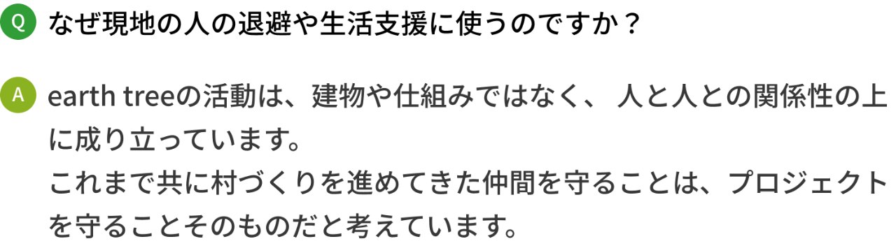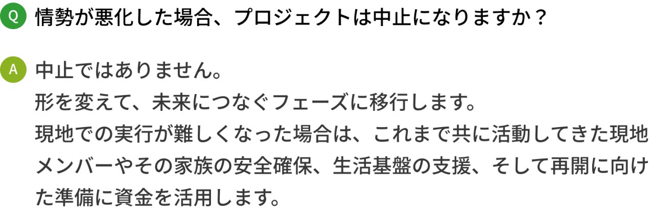 万が一、情勢の悪化により 現地での事業実行が困難になった場合、 本プロジェクトで集まった資金は村の人たちができる限り安全に避難し 生活を守り、元の土地に戻り、再び挑戦を始められるようにするために使用させていただきます。