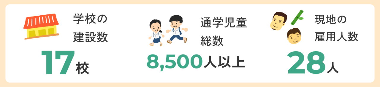 これまでに17校の学校建設に関わり、通学児童数は8,500人を超え、現地で28名の雇用を生み出すことができています。