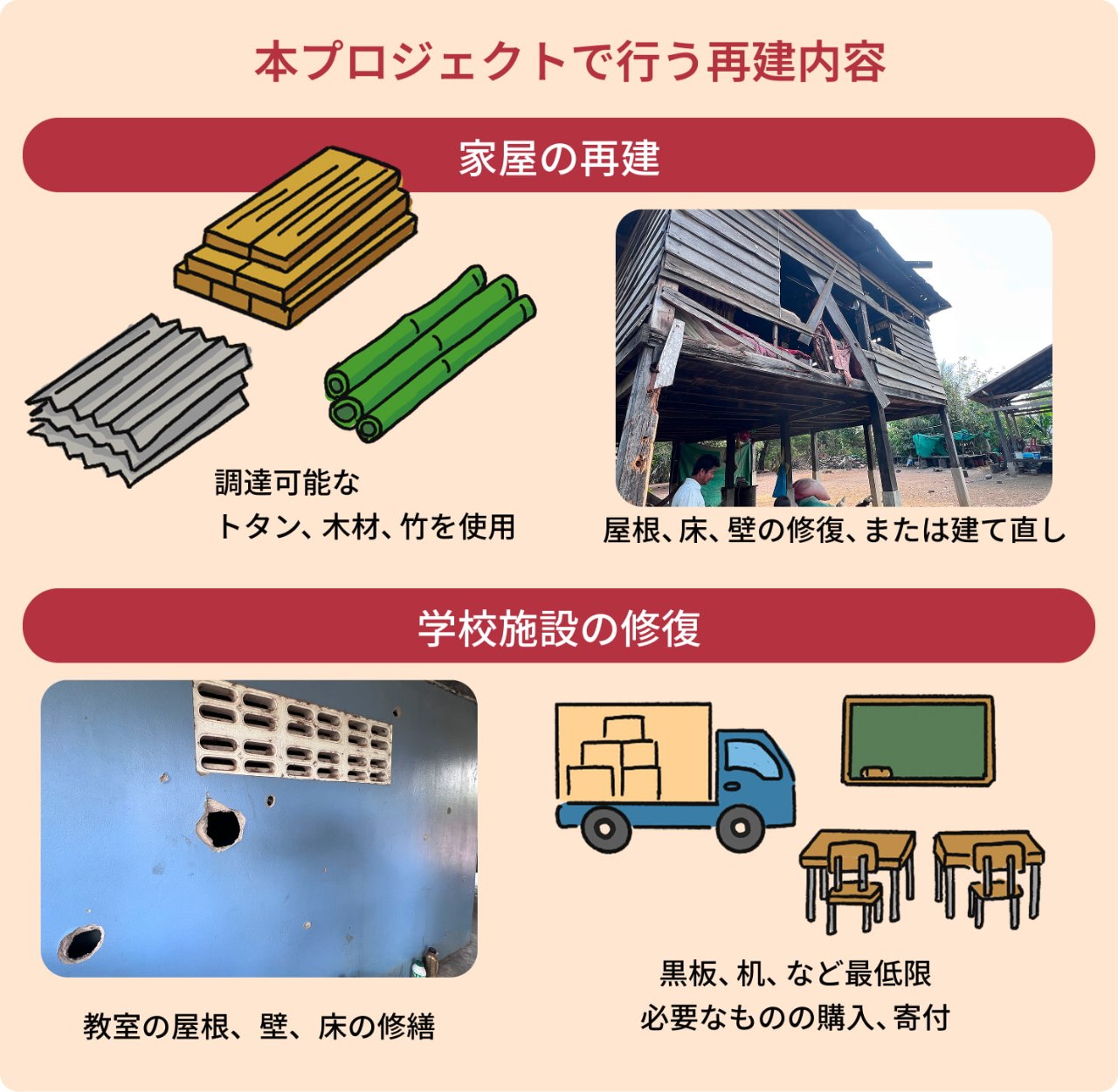 教室の屋根・壁・床の修繕 窓・扉の補修 簡易な机・黒板などの教育備品