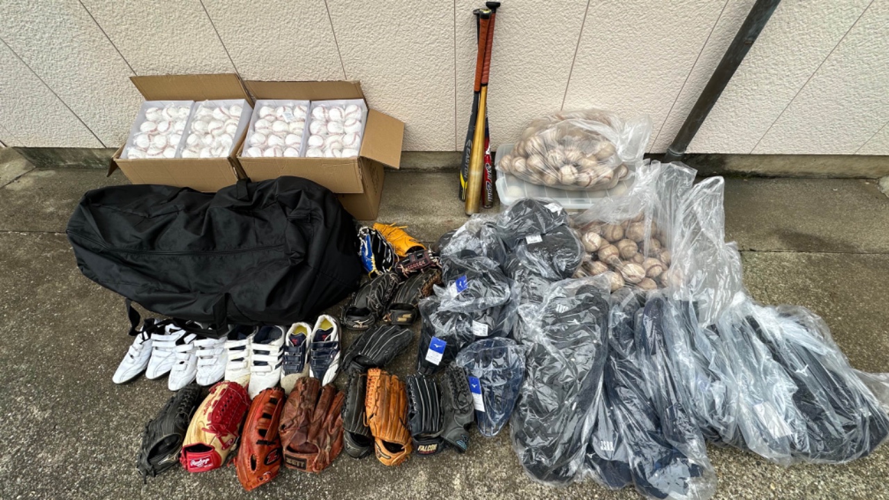 今までに寄贈した野球用具は、ボール約4000個、グローブ約250個、スパイク約100足、バト約50本、キャッチャー防具、バッティング手袋、運動靴などなど。