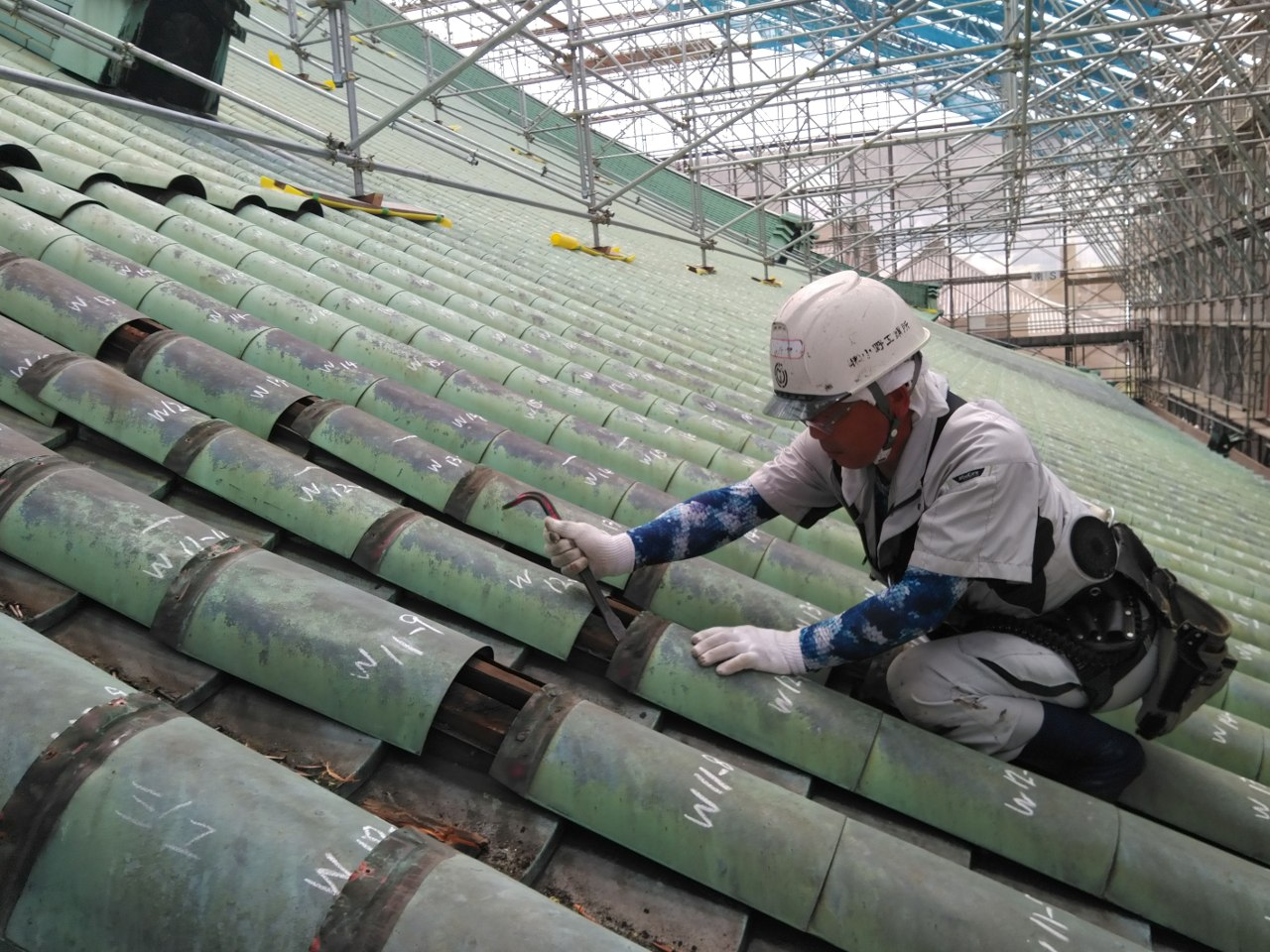 雨をしのげるようになった今月、ようやく銅板瓦の取り外し作業が始まりました。