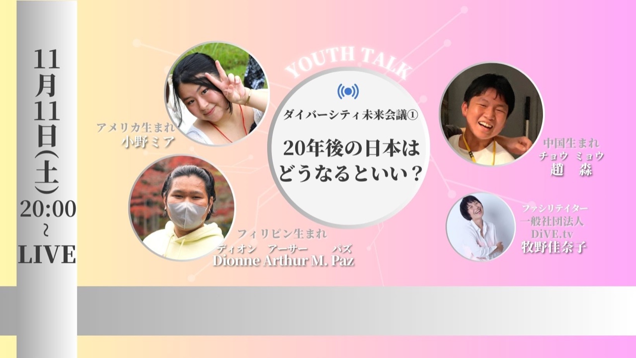 2023-11-10 00:01オンラインの若者トークセッションを開催します!クラファン終了まで残り1ヶ月!! 拡散ご協力お願いキャンペーンとして、若者トークセッションを開催いたします。 第1回は、海外で生まれ育った3人の若者です。是非ご視聴ください!2023-11-10 00:01オンラインの若者トークセッションを開催します!クラファン終了まで残り1ヶ月!! 拡散ご協力お願いキャンペーンとして、若者トークセッションを開催いたします。 第1回は、海外で生まれ育った3人の若者です。是非ご視聴ください!