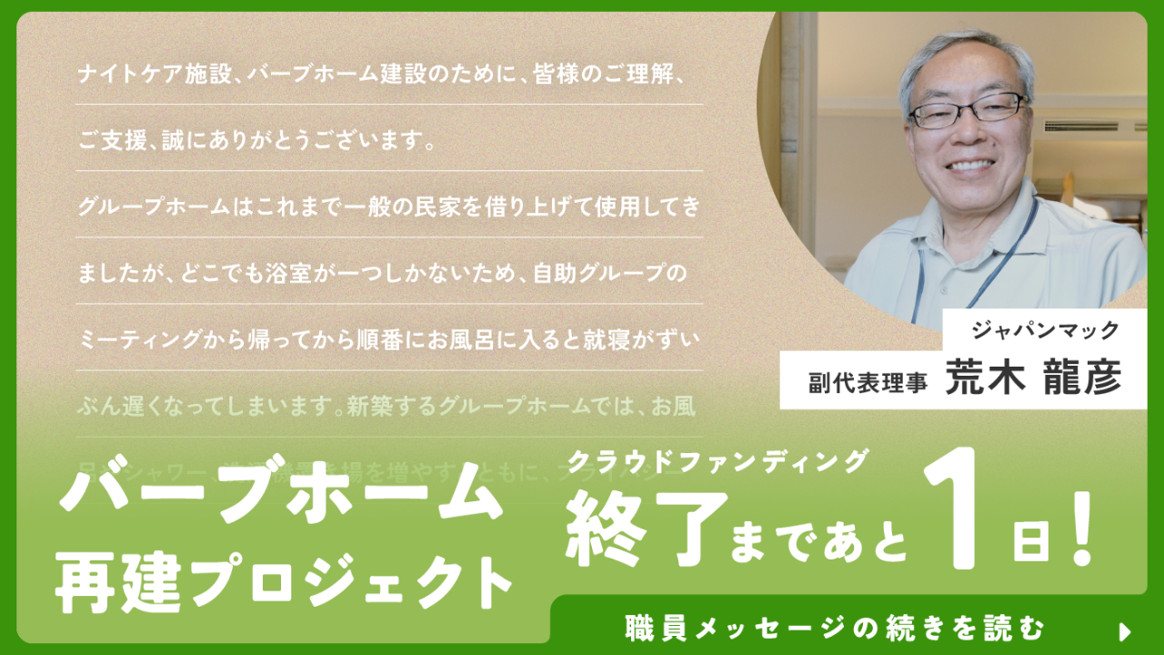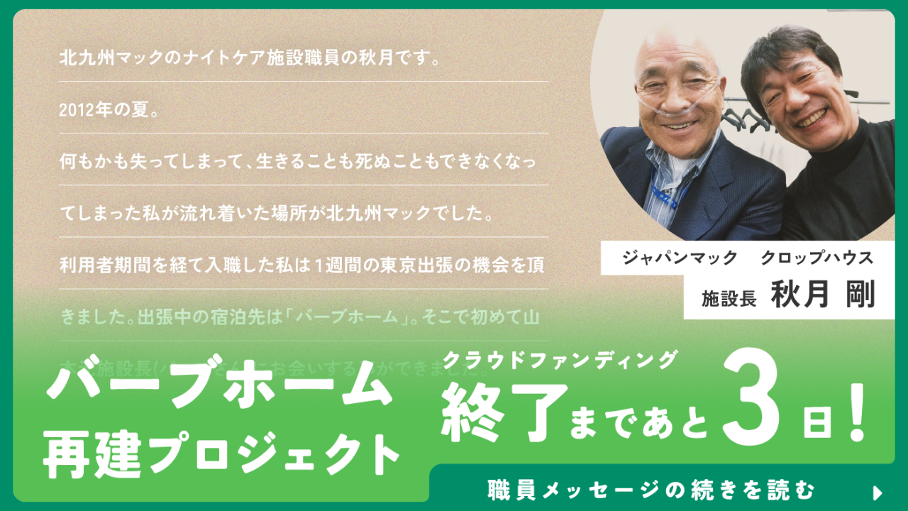 2024-12-03 20:00⏰あと3日⏰クロップハウス秋月よりお願いメッセージが届きました!10/6よりはじまったバーブホーム再建プロジェクト終了まで、あと3日になりました!皆様からの最後の追い上げの勢いがありがたいです…!ジャパンマック クロップハウス施設長の秋月より、クラウドファンディングのお願いメッセージが届きました。2024-12-03 20:00⏰あと3日⏰クロップハウス秋月よりお願いメッセージが届きました!10/6よりはじまったバーブホーム再建プロジェクト終了まで、あと3日になりました!皆様からの最後の追い上げの勢いがありがたいです…!ジャパンマック クロップハウス施設長の秋月より、クラウドファンディングのお願いメッセージが届きました。