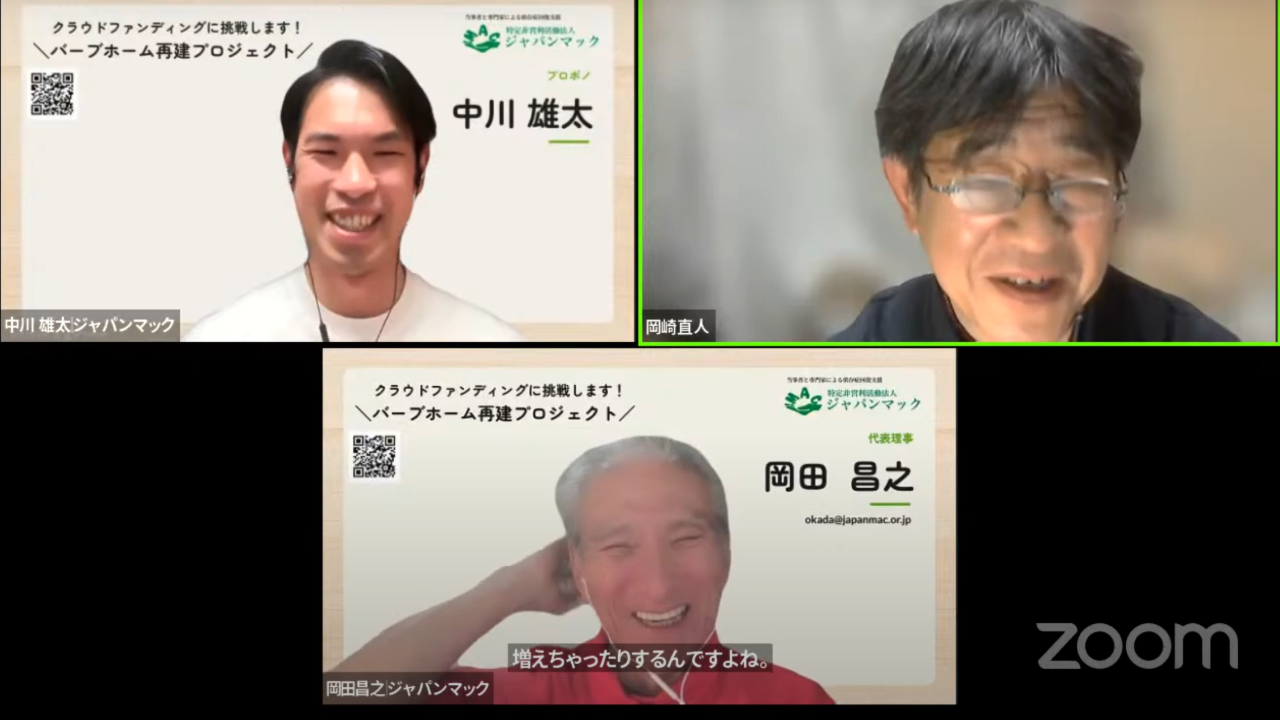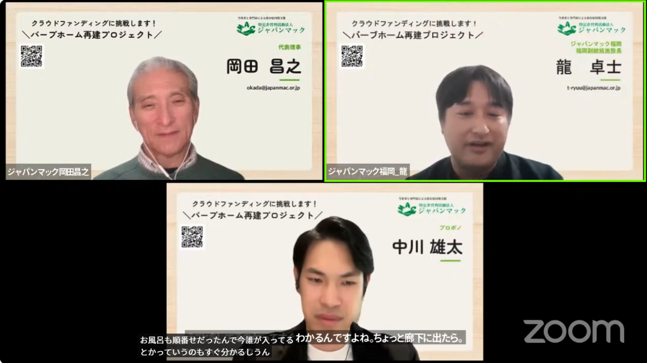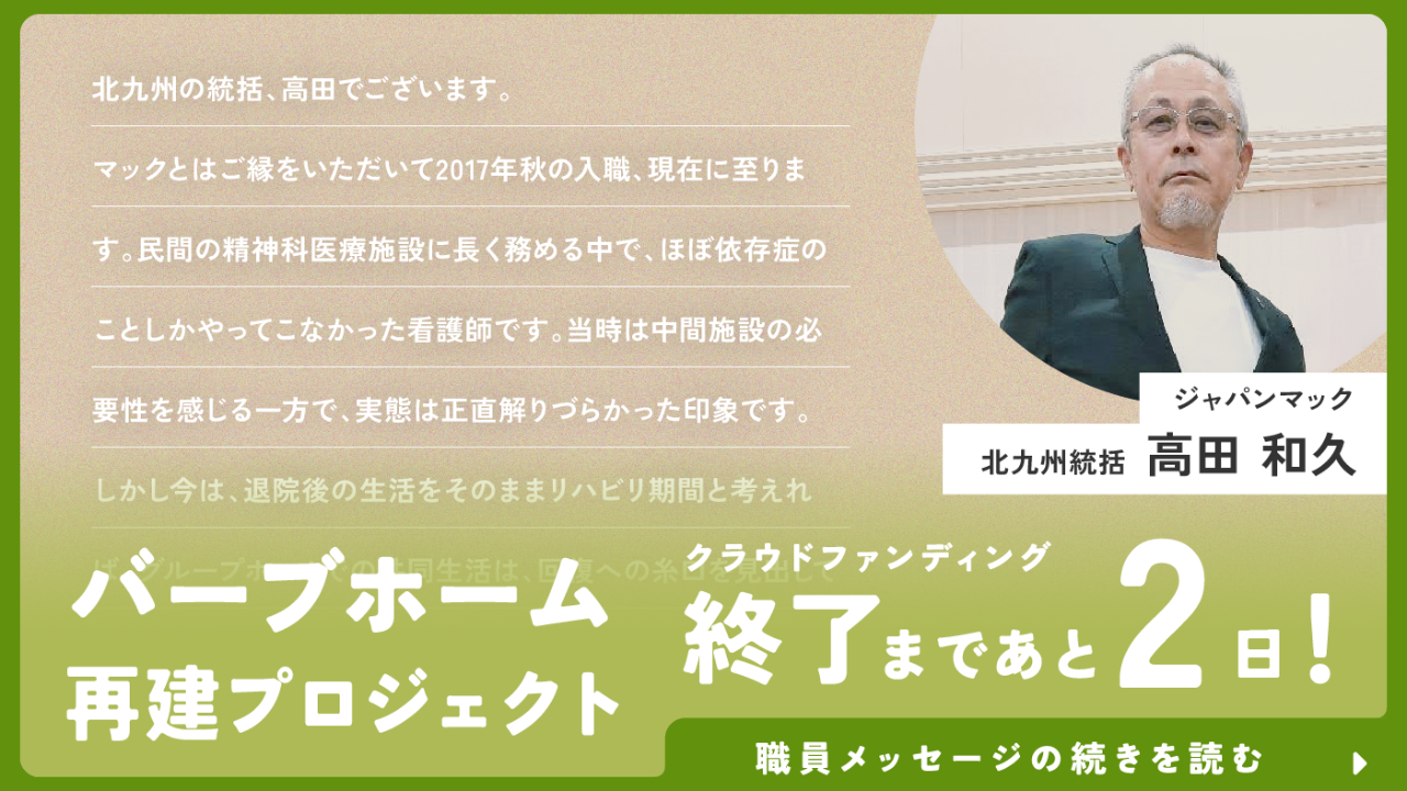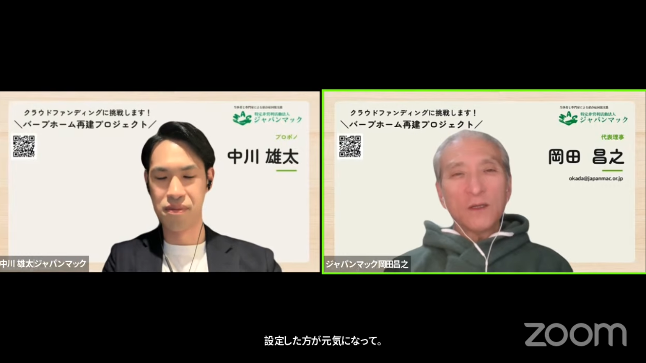 2024-12-06 11:00クラファン連続対談企画第2.5弾の開催レポートです!11月21日、直前に開催が決まり、YouTubeにてジャパンマック福岡施設長龍氏と、ジャパンマック代表の岡田で「バーブホーム再建の役割とは~ナイトケア施設入居経験ジャパンマック職員と語る~」をテーマに、ライブ配信をしました!アーカイブも詳細ページからご覧いただます。2024-12-06 11:00クラファン連続対談企画第2.5弾の開催レポートです!11月21日、直前に開催が決まり、YouTubeにてジャパンマック福岡施設長龍氏と、ジャパンマック代表の岡田で「バーブホーム再建の役割とは~ナイトケア施設入居経験ジャパンマック職員と語る~」をテーマに、ライブ配信をしました!アーカイブも詳細ページからご覧いただます。