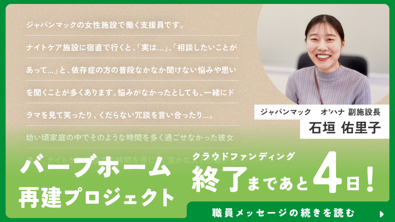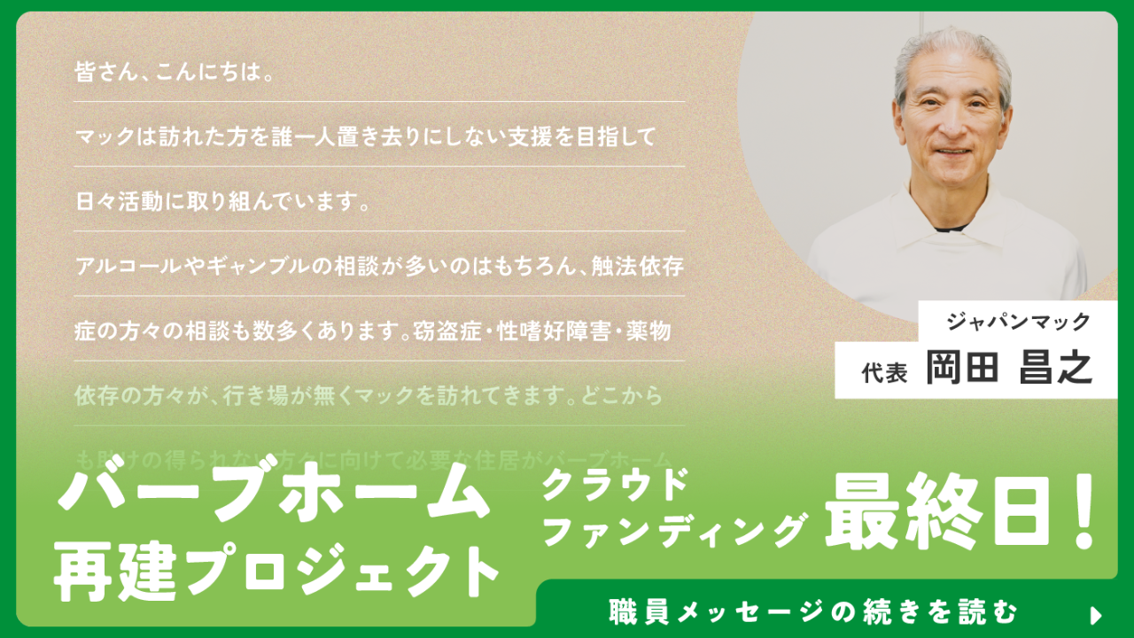 2024-11-11 18:00📣クラウドファンディング告知連続企画 開催クラウドファンディング告知連続企画として、普段からジャパンマックの活動にご協力いただいている、依存症回復支援に関わる方々と代表岡田の対談をYouTubeにて配信いたします。 この機会に、依存症とはなにか、ジャパンマックの活動などを皆さんに知っていただきたいです。2024-11-11 18:00📣クラウドファンディング告知連続企画 開催クラウドファンディング告知連続企画として、普段からジャパンマックの活動にご協力いただいている、依存症回復支援に関わる方々と代表岡田の対談をYouTubeにて配信いたします。 この機会に、依存症とはなにか、ジャパンマックの活動などを皆さんに知っていただきたいです。