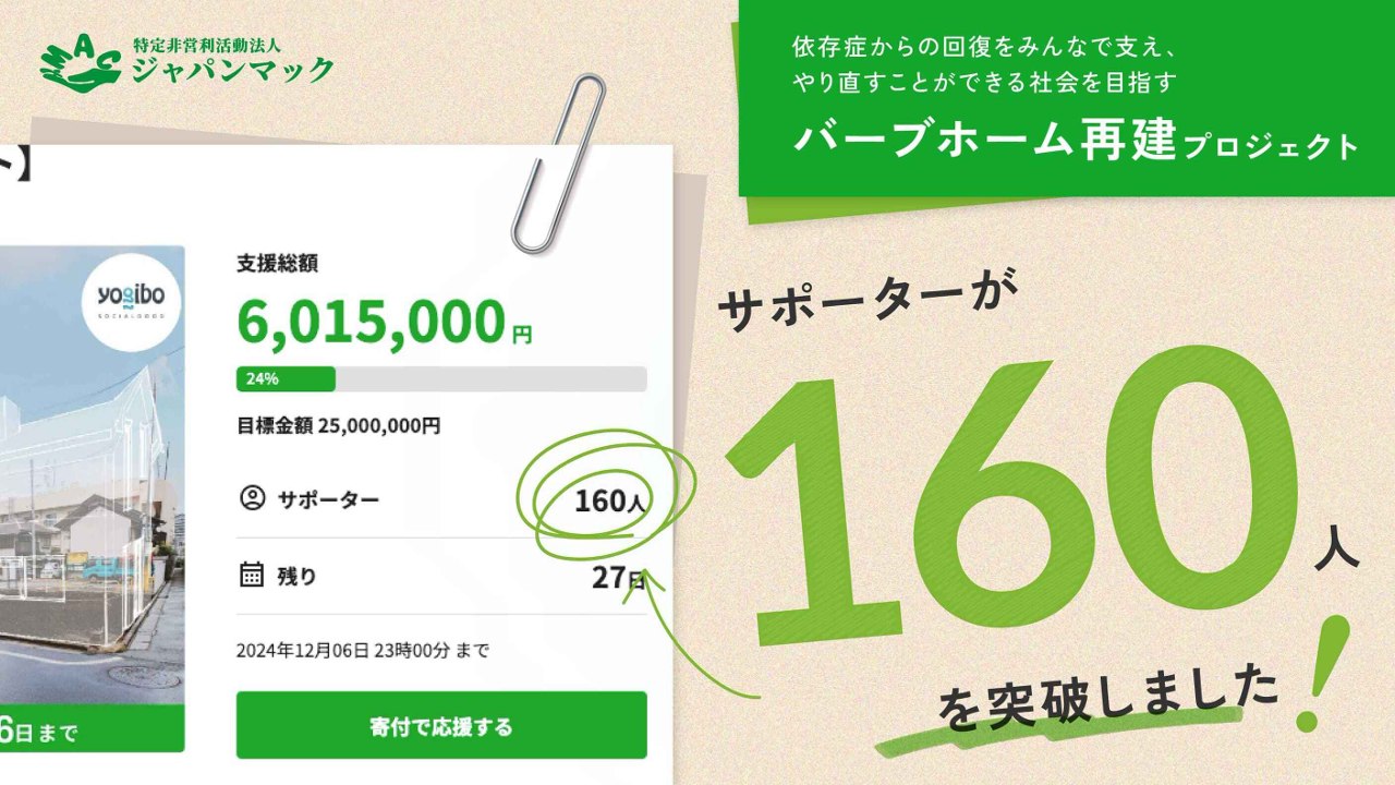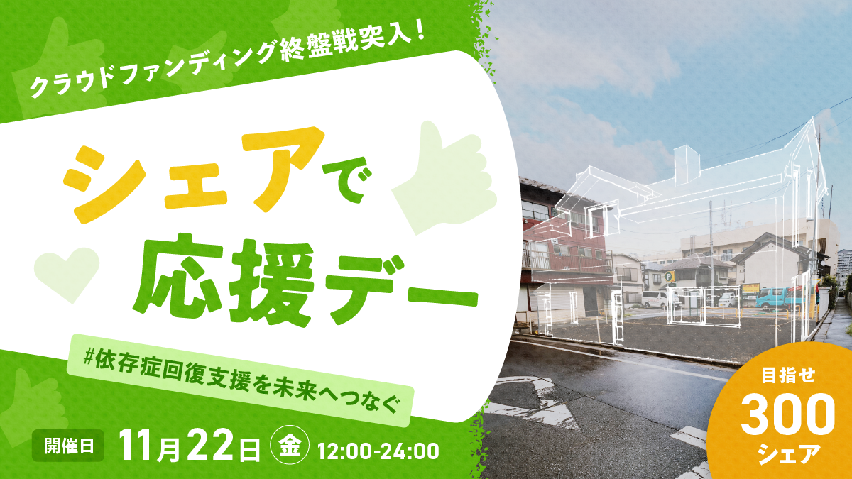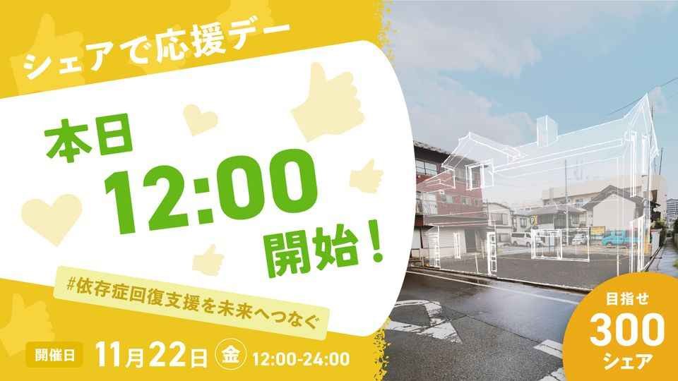 2024-11-22 11:26📣本日12時より「シェアで応援デー」開始!300シェア目標!本日12~24時、「シェアで応援デー」を開催します!シェアで応援デーは、#依存症回復支援を未来へつなぐ を付けて、バーブホーム再建プロジェクトページを広める投稿を X や Facebook などのSNSでおこない、より多くの人にクラウドファンディングを知ってもらうための企画です!2024-11-22 11:26📣本日12時より「シェアで応援デー」開始!300シェア目標!本日12~24時、「シェアで応援デー」を開催します!シェアで応援デーは、#依存症回復支援を未来へつなぐ を付けて、バーブホーム再建プロジェクトページを広める投稿を X や Facebook などのSNSでおこない、より多くの人にクラウドファンディングを知ってもらうための企画です!