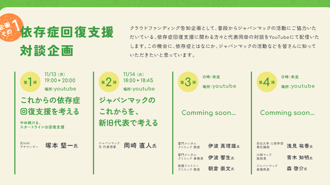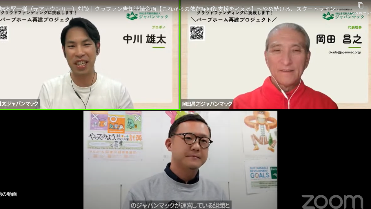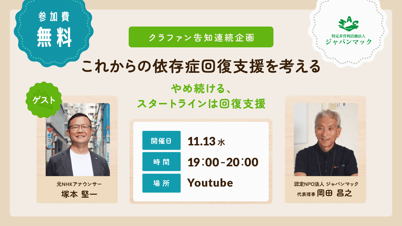 2024-11-20 10:00クラファン告知連続対談企画 第1弾を開催しました!11月13日、YouTubeにて塚本堅一氏(元NHKアナウンサー)をお招きし、ジャパンマックの岡田昌之代表と「依存症回復支援の在り方」について、ライブ配信をしました!アーカイブも詳細ページからご覧いただます。2024-11-20 10:00クラファン告知連続対談企画 第1弾を開催しました!11月13日、YouTubeにて塚本堅一氏(元NHKアナウンサー)をお招きし、ジャパンマックの岡田昌之代表と「依存症回復支援の在り方」について、ライブ配信をしました!アーカイブも詳細ページからご覧いただます。