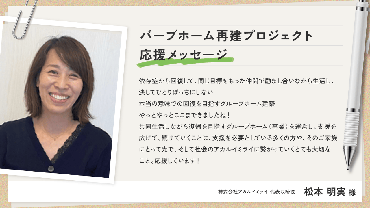 2024-11-14 18:57📩株式会社アカルイミライの松本様より応援メッセージが届きました株式会社アカルイミライ 代表取締役 松本 明実様より、あたたかなご支援と応援メッセージをいただきました!松本様からのメッセージは、画像よりご覧いただけます!2024-11-14 18:57📩株式会社アカルイミライの松本様より応援メッセージが届きました株式会社アカルイミライ 代表取締役 松本 明実様より、あたたかなご支援と応援メッセージをいただきました!松本様からのメッセージは、画像よりご覧いただけます!