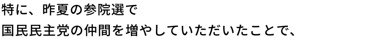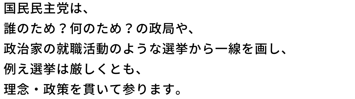 国民民主党代表、玉木雄一郎です。 国民民主党は2020年9月、「つくろう、新しい答え。」を掲げ、衆参15人の国会議員で船出しました。 いい政治は与党だけではつくれない。 いい野党がいてこそ国会に緊張感が生まれ、政策実現のエンジンになる。 「対決より解決」 否定や反対をするなら提案をセットですることを自分たちに課してきました。 あれから5年4カ月、党所属の国会議員は52人、全国の自治体にも沢山の仲間たちが誕生し、今日も「手取りを増やす」政策実現に奔走しています。 衆議院議員選挙が始まります。 与党は政策より政局、野党は政策より選挙。そんな『古い政治』が日本社会を停滞させてきたと断言できるので、国民民主党は『新しい政治』をつくります。皆さんと共に。 「みんなでつくろう、新しい答え。」